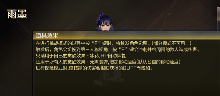 致命点打击整体像一把减小范围和打出速度,但大幅度加强收回效率的轻型军用手斧,且没有移速惩罚的特性让雨墨在刀战中相当于多装备一把可以一击必杀的近战武器;觉醒技能冰花在挑战模式中可显著减缓怪物移动速度,无论是协助团队清理大量怪物还是被怪物围攻时作为突围技能也非常实用。
