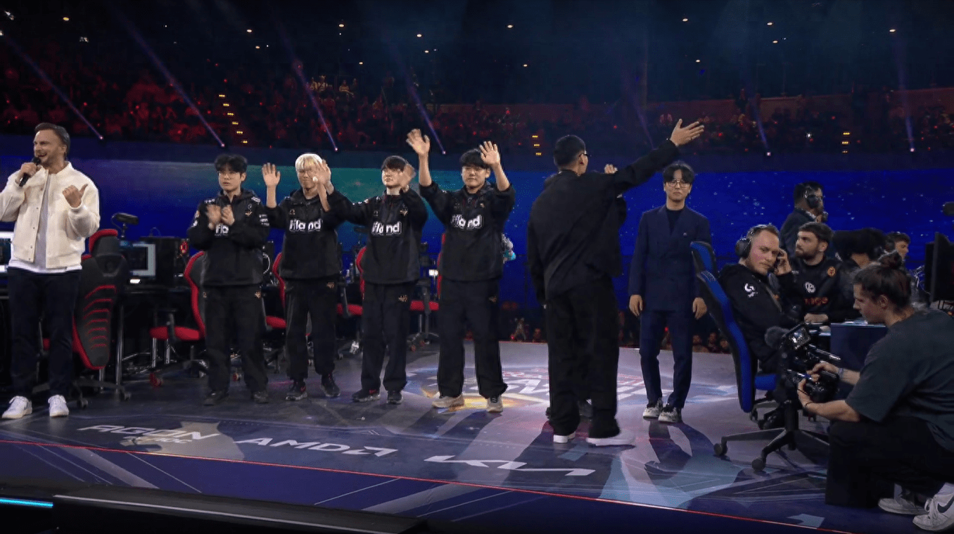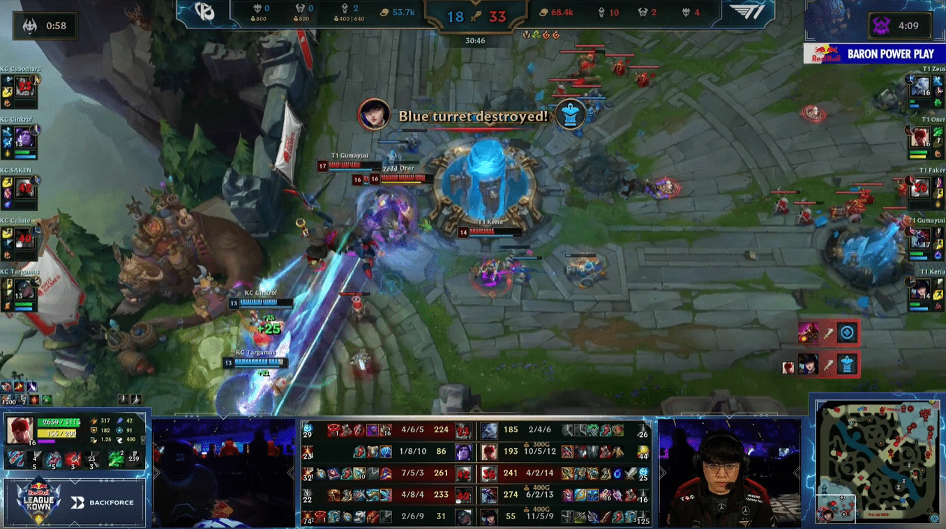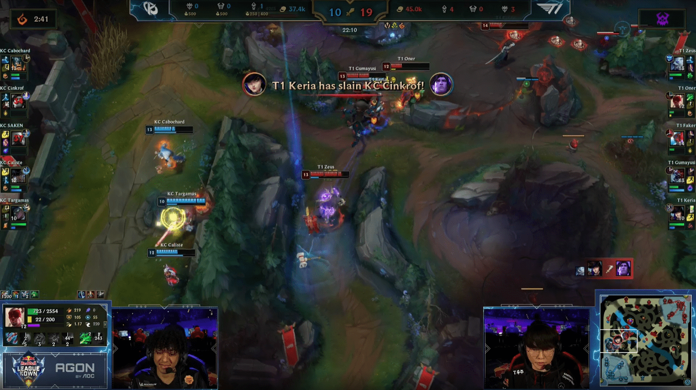 似乎大多数参赛队伍面对T1都觉得自己赢不了,所以会选择比较娱乐的阵容一样。KC拿出了打野宝石,下路妮菈和塞娜的组合。而T1则是上单Zeus玩狗熊,中单Faker秀出永恩,下路Gumayusi玩起了大虫子ADC,辅助则是Keria的女警。基本上和此前2局没什么太大区别,KC可以拿到一些击杀,但是经济差随着时间流逝越拉越大,T1稳步扩大优势。