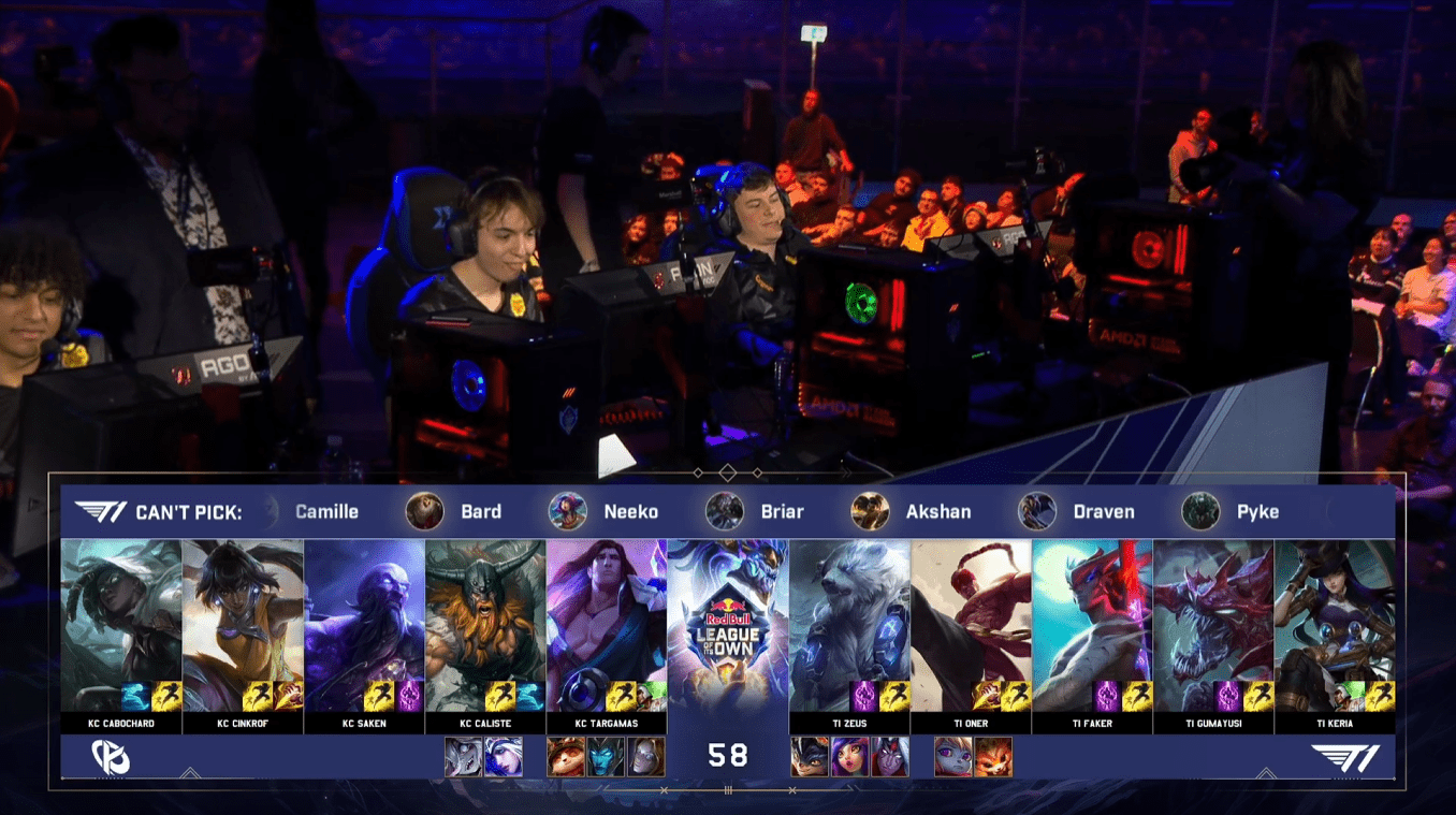 T1在欧洲车轮战迎来第三局,他们此前已经用了10个英雄了,在最后一场打G2之前,这些英雄全都不能再次选用了。T1的第三个对手是来自欧洲大师赛的KC,也是下个赛季晋级到LEC的队伍,不过他们启用的仍然是大师赛的阵容。这是一支已经具有一定较高竞技实力的对手了,不过T1仍然是选择了非常娱乐的阵容。