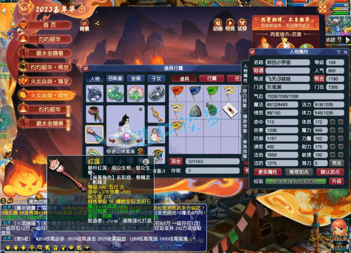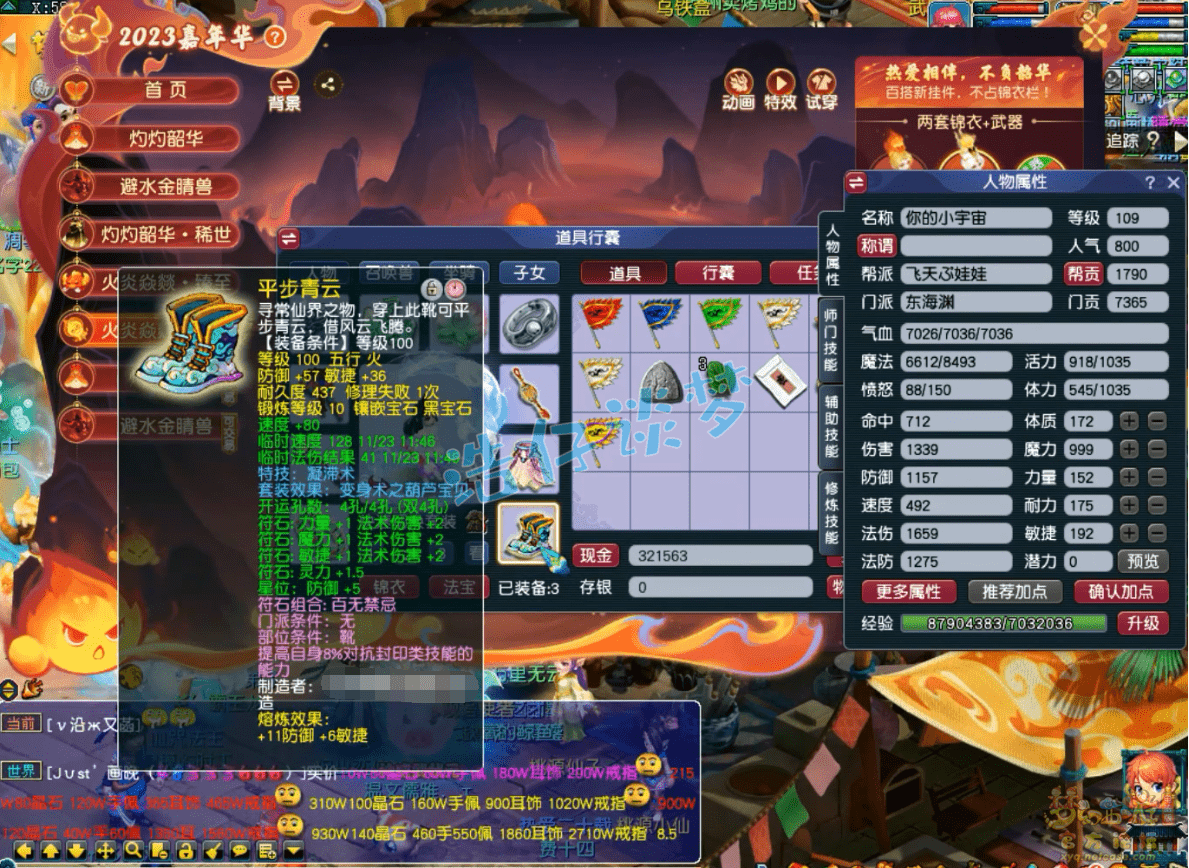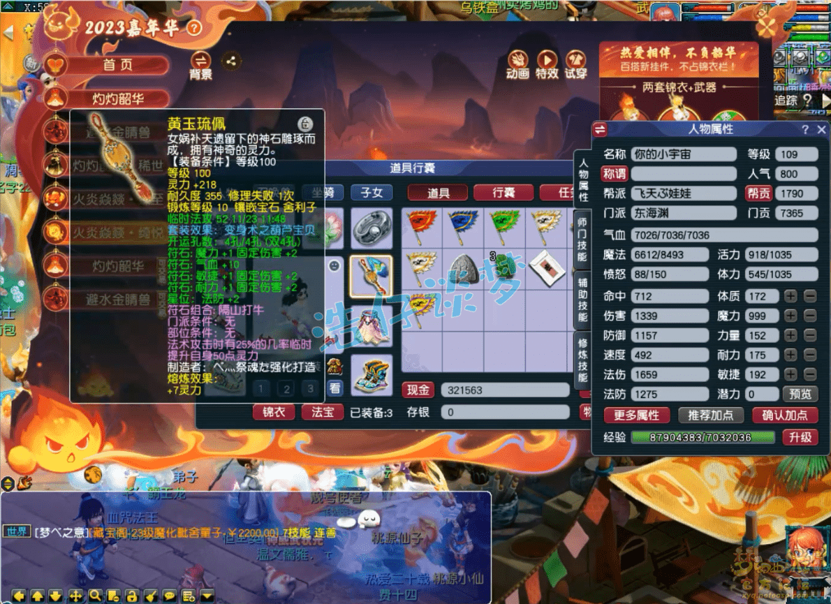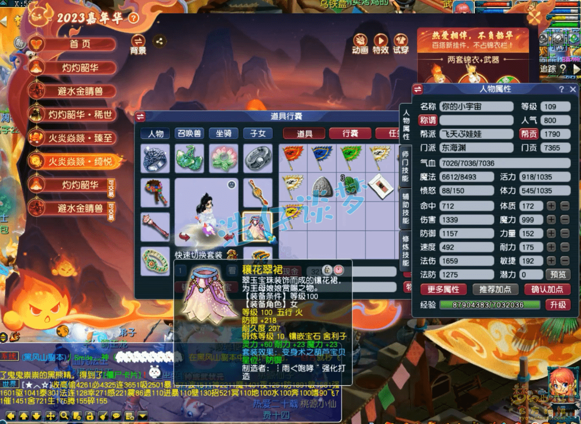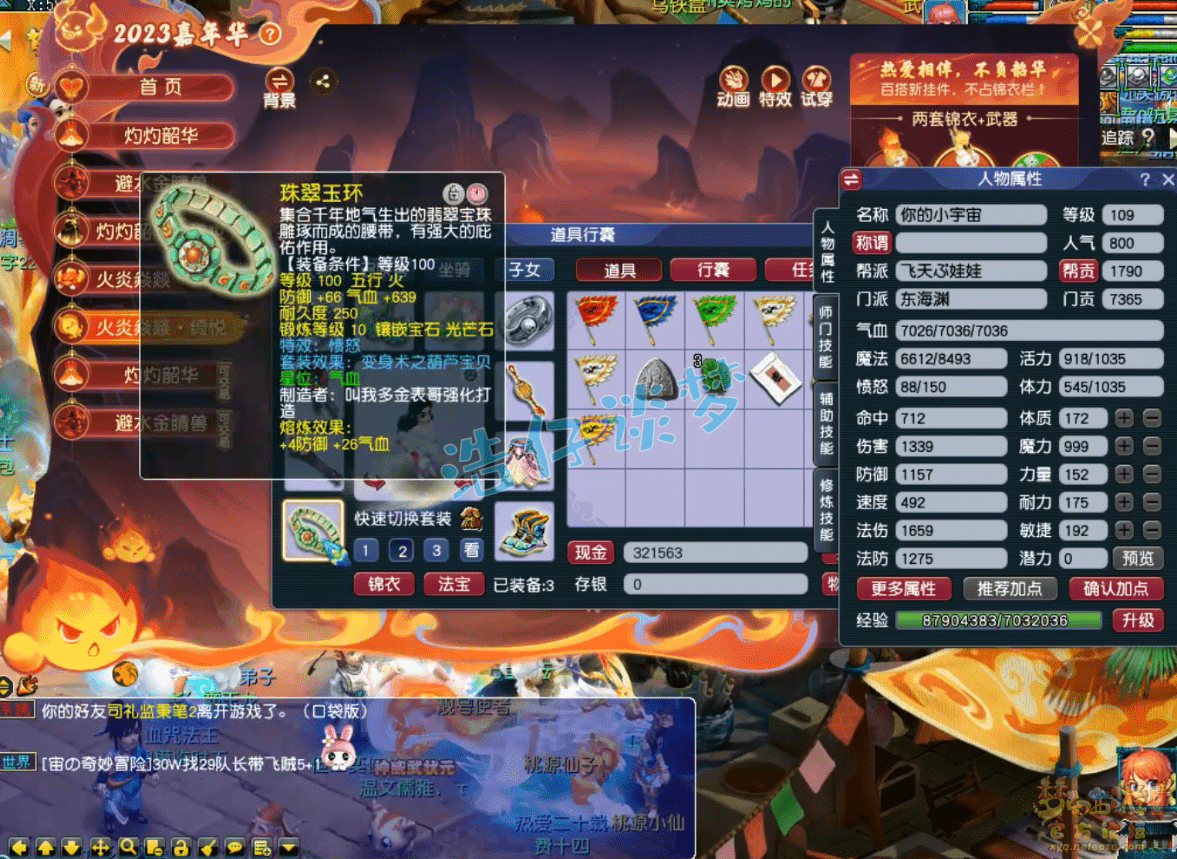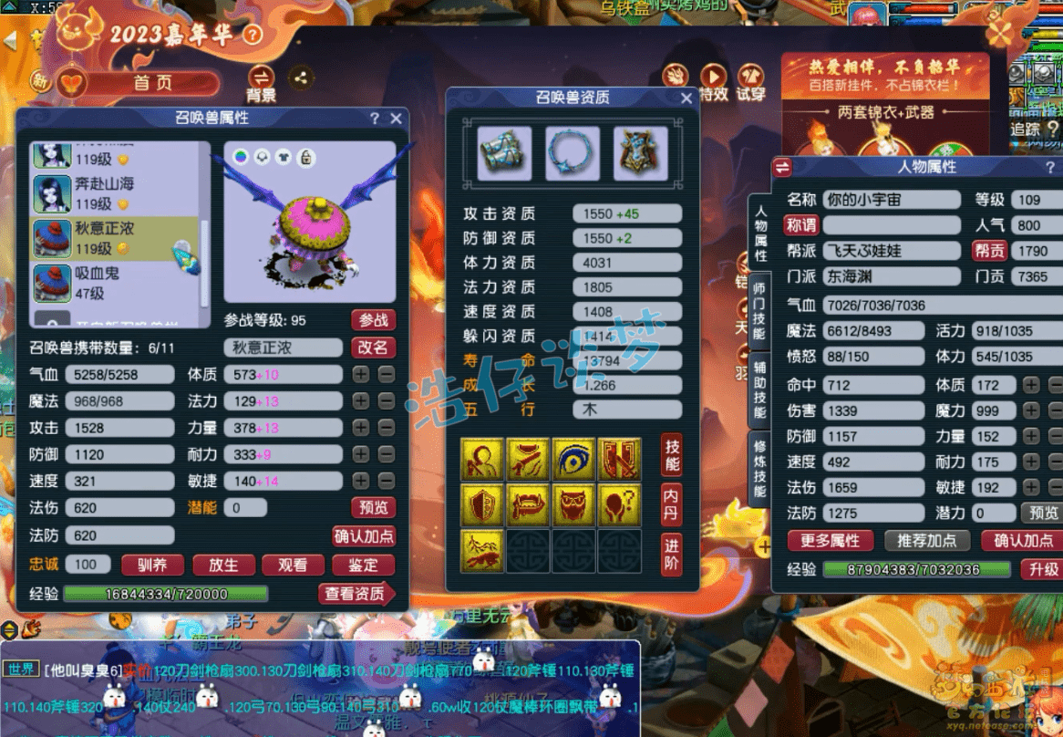 109级东海渊没打满临时符的面板属性,打满临时符,带上PK装备,法伤能达到1800以上,对于109级来说还是很不错的!