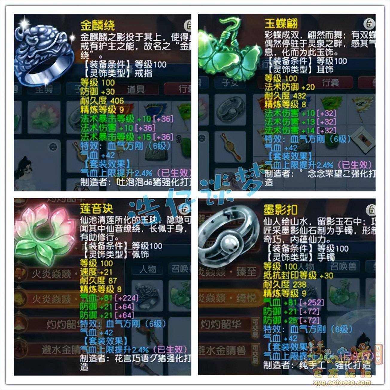 戒指下排双法暴一法伤,耳饰下排三法伤,佩饰和手镯下排都是双防御一气血,特效都是6级血气方刚!