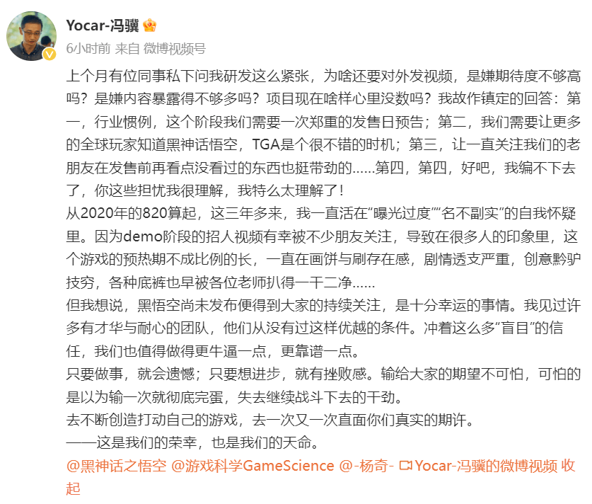 而在TGA发布全新预告之余,游戏科学美术总监杨奇和CEO冯骥在微博上发文,直言“曝光过度的焦虑一直存在”。