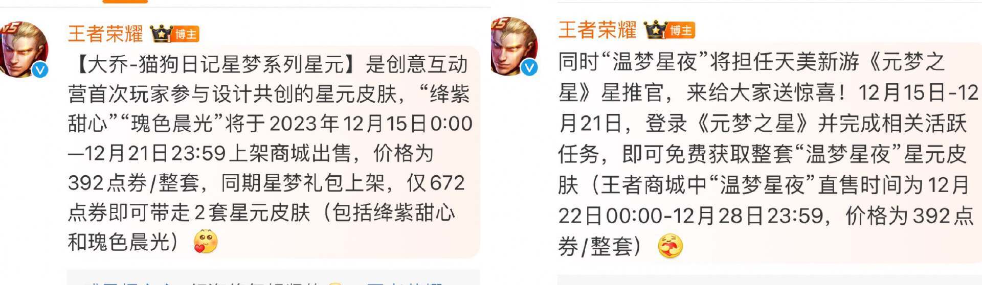 大乔的猫狗日记之所以会迎来优化,也是因为这周更新之后会给这款皮肤出星梦皮肤,也就是三套星元皮肤。此外这周更新之后,还会上线蒙犽的源梦皮肤。