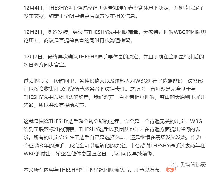 之后theshy告知WBG自己决定春季赛休息,双方约好了全明星后官宣,但是随后舆论发酵,一起商量是否要提前官宣,同时WBG再次挽留theshy,最终就是7号theshy确定休息,大家也约好同步官宣。最后WBG老板也表示有很多人对俱乐部造谣诽谤,会收集证据追究法律责任。并且再次强调,theshy没有在待遇方面提出任何诉求,WBG也给他开了顶薪,他休息是个人选择,希望他回归的时候可以再续前缘。
