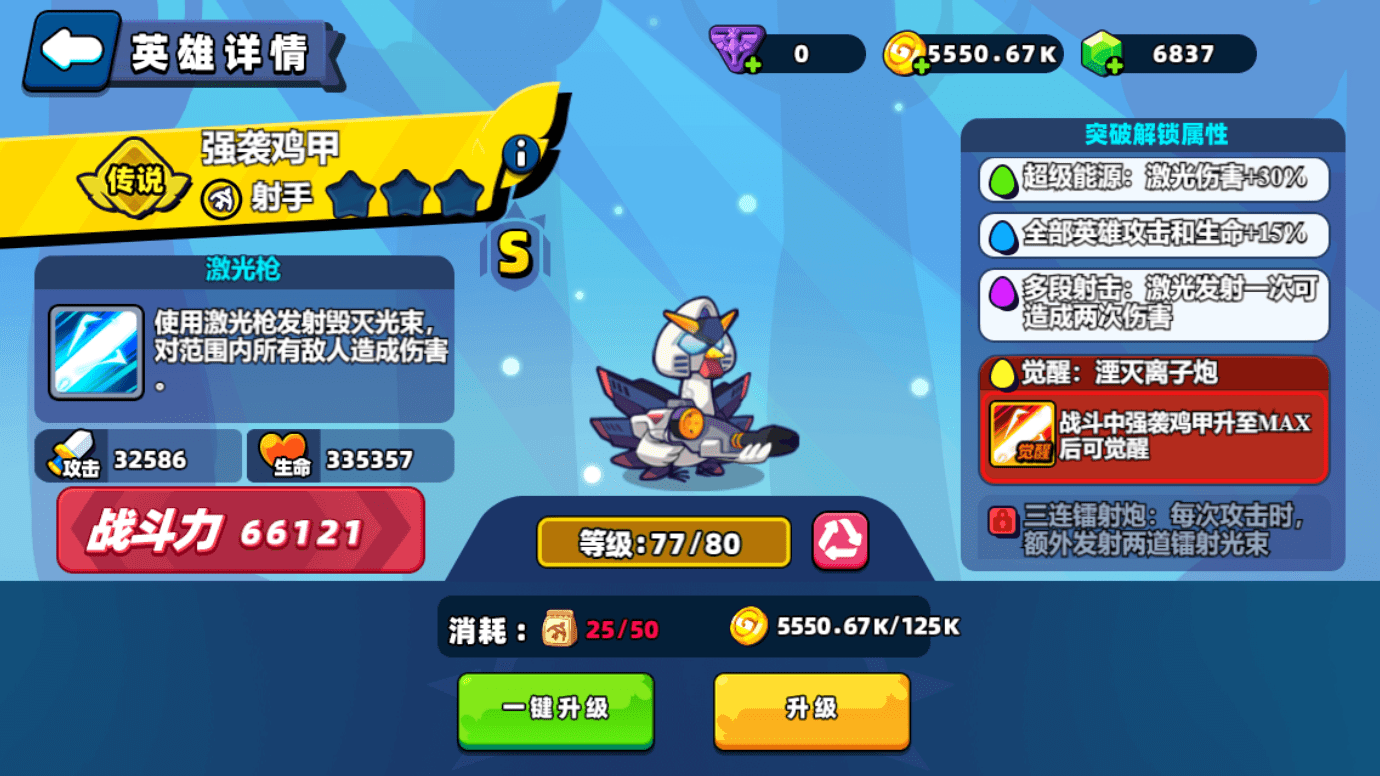 技能:使用激光枪发射毁灭光束对范围内所有敌人造成伤害。觉醒技能:使用湮灭离子炮攻击敌人,拥有毁天灭地的力量。神话觉醒技能:三连镭射炮:每次攻击时额外发射两道镭射光束