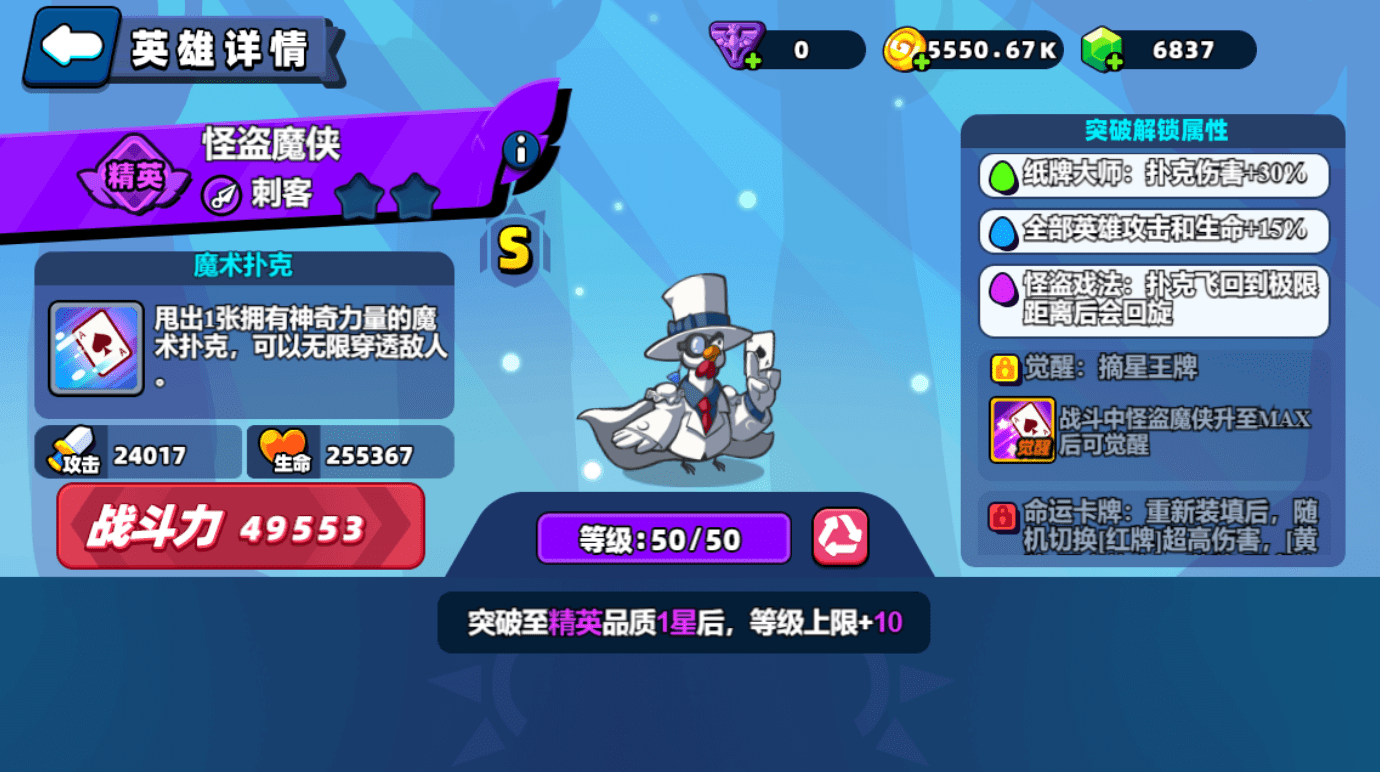 技能:甩出1张拥有神奇力量的魔术扑克,可以无限穿透敌人。觉醒技能:窃取象征命运的星星,化为6个命运卡牌攻击敌人,可无限穿透并回旋。神话觉醒技能:命运卡牌: 重新装填后,随机切换[红牌]超高伤害,[黄牌]巨大扑克,[蓝牌]更多扑克