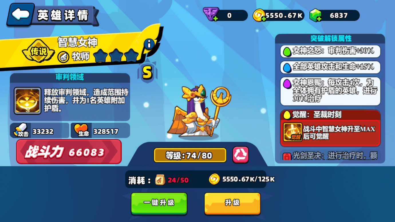 技能:释放审判领域,造成范围持续伤害,并为1名英雄附加护盾。觉醒技能:对敌人进行有罪裁定,落下审判之剑,造成大范围伤害。神话觉醒技能:光剑圣决:进行治疗时,额外释放光剑圣决,可无限穿透。