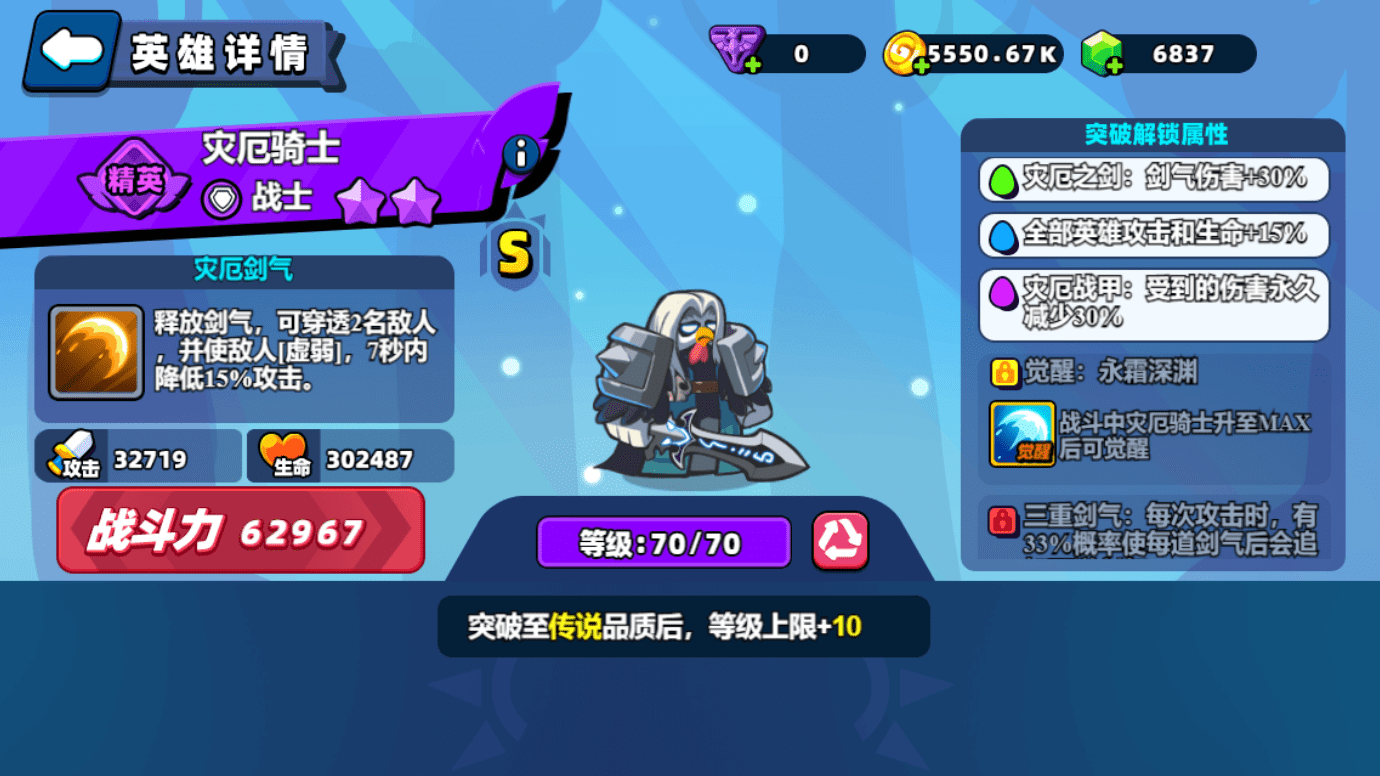 技能:释放剑气,可穿透2名敌人并使敌人[虚弱],7秒内降低15%攻击。觉醒:永霜深渊,传承自远古永霜深渊,释放3道可穿透4次的深渊剑气。神话觉醒:三重剑气,每次攻击时,有33%概率使每道剑气后会追加两道剑气