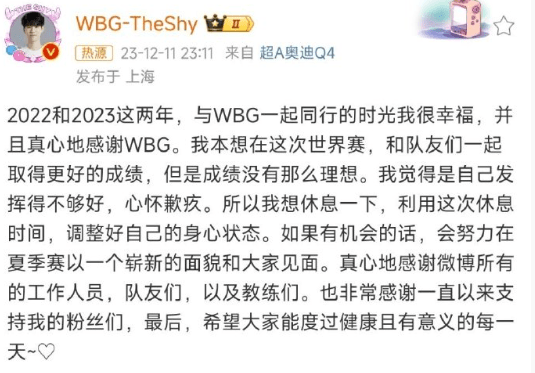 12月12日凌晨,TheShy发布微博宣布自己春季赛将要休息,借助休息的时间调整状态,努力在夏天与大家再次见面。