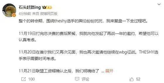 第一就是石头赶路称休息是Theshy自己做出的决定,早在11月21号WBG方面就给出了联盟规定顶薪,并多次挽留。奈何Theshy去意已定,这才无奈放弃。