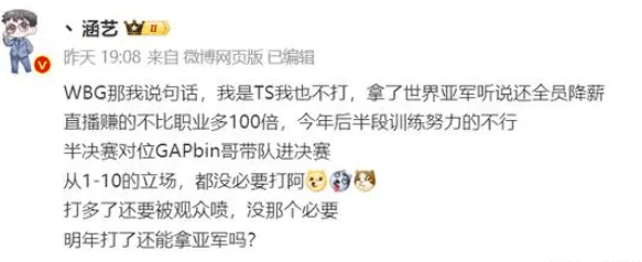 当然了这样的情况显然不能说服观众,对于第一点涵艺就直接爆料WBG方面在拿到世界亚军后还要让选手降薪,因此是导致Theshy不打的主要原因,毕竟直播肯定要比打比赛赚钱来的多。