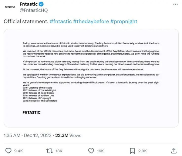在这篇通知中,FNTASTIC向玩家们表达了歉意,并以一种坦诚但摆烂的口吻说道:我们已经没钱了,工作室宣布倒闭,游戏没有后续更新,服务器还会继续运行(尽管玩家普遍反映根本登不上去)。