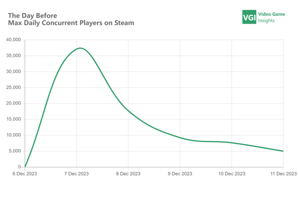 游戏的CCU曲线在12月7至8日达到峰值,为37080,之后断崖式下滑至今日的不足5000人。