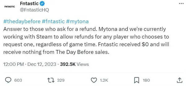 FNTASTIC最新的帖文也表示,正在和Steam协商退款问题,确保所有玩家无论游戏时长多久都能获得退款: