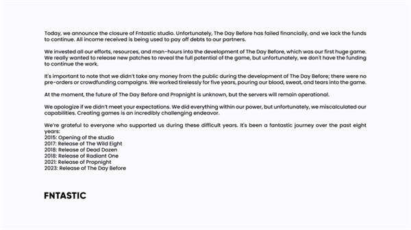 在通知的最后,FNTASTIC还回顾了工作室自2015年至今的发展历程,颇有几分对自己功败垂成的惋惜之意。