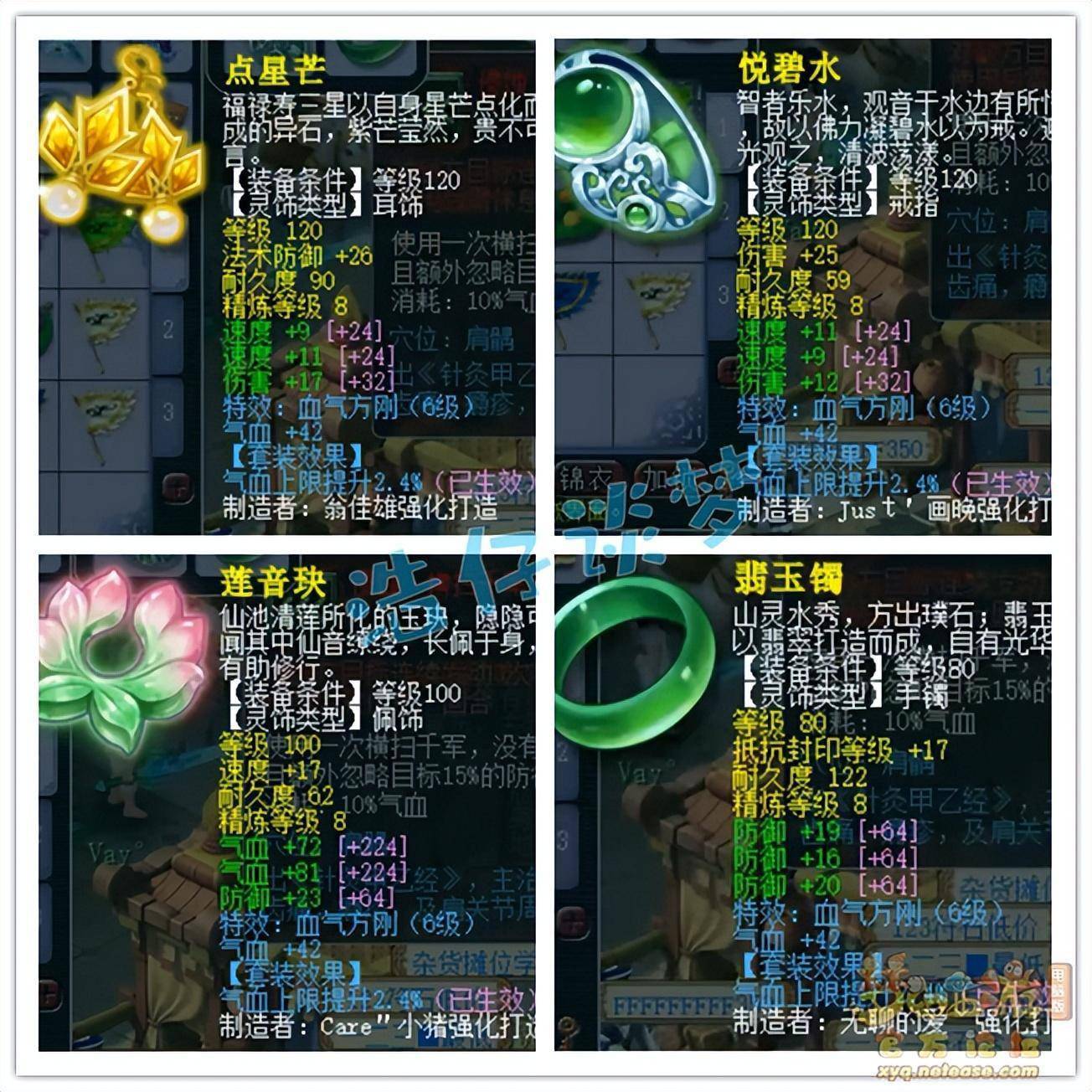 戒指和耳饰下排都是双速度一伤害,大唐速度很重要,所以选择速度灵饰也不错,性价比很高,佩饰下排双气血一防御,手镯下排三防御,全部打了8锻星辉石,特效6级血气方刚!