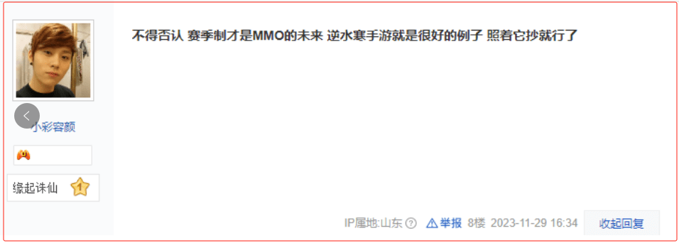 《逆水寒》赛季服的成功,深刻的影响了网易游戏从业者,也让即将上线的《逆水寒》手游主策划倍加鼓舞——原本他就想一扫传统MMO的顽疾,坚持走“不肝不氪”的道路,但碍于市场上并无先例,因此还有所犹豫。而《逆水寒》赛季服的大受好评,直接坚定了他的信心。