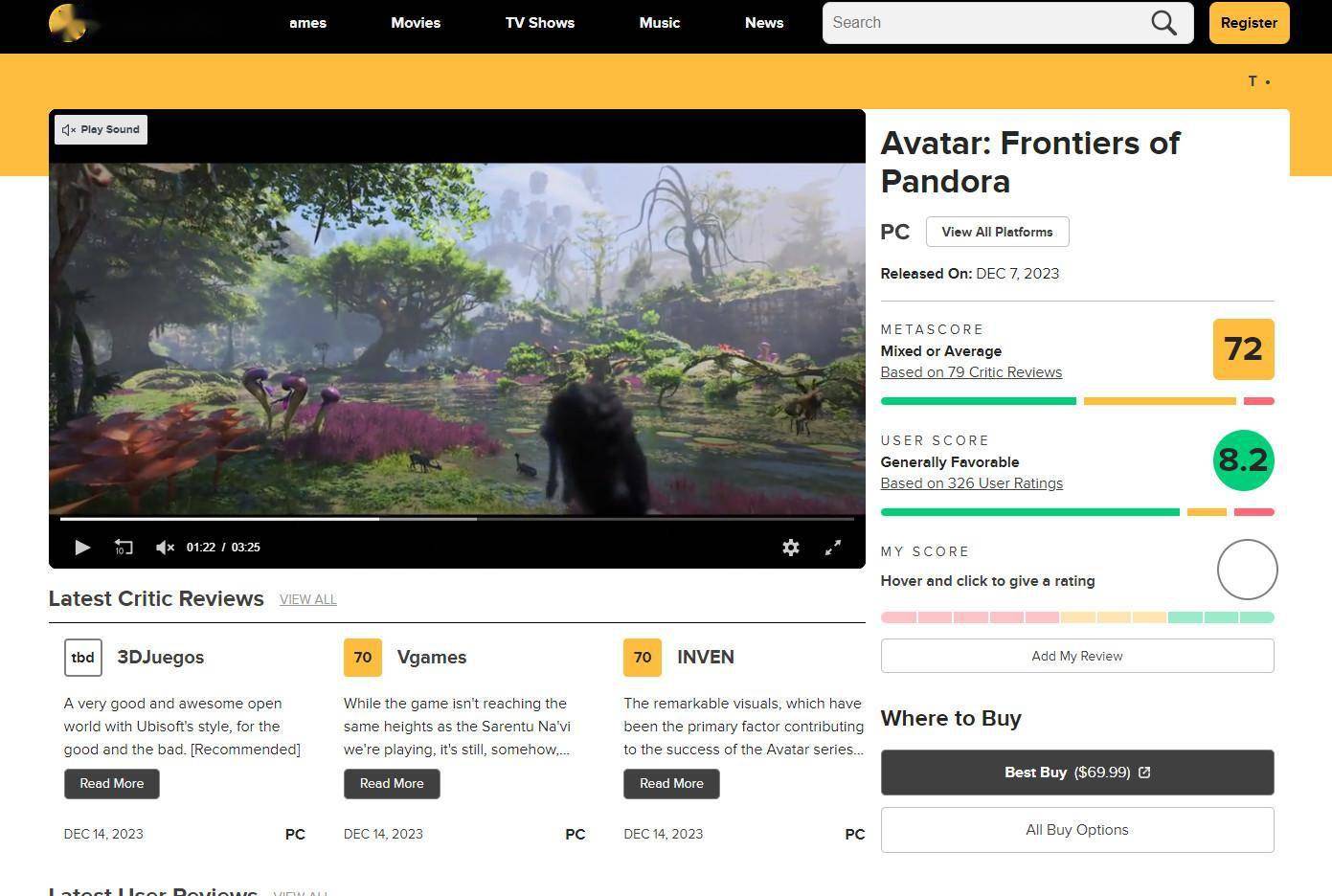 不过,除了视觉效果之外,这款游戏并没有给媒体留下太深刻的印象。大多数评分都在7分左右徘徊。幸运的是,用户的评价更为积极,《阿凡达:潘多拉边境》在Metacritic上的评分为8.2分(满分10分),甚至超过了育碧今年另外一款大作《刺客信条:幻景》,该作的用户评分只有7.4分。