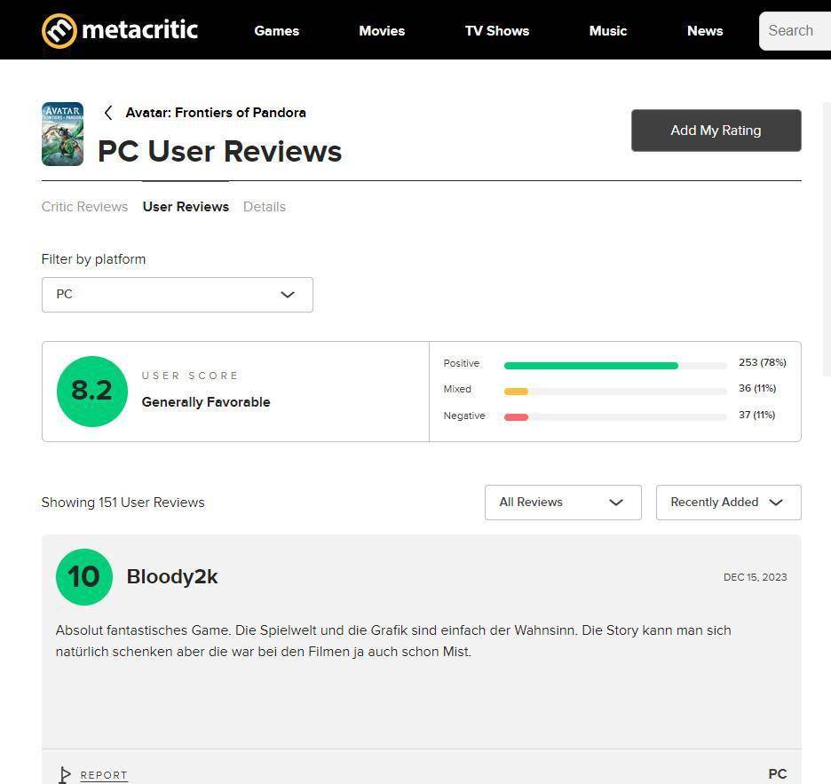 截止到发稿时,《阿凡达:潘多拉边境》有大约326条用户评论,平均评分非常乐观。78%的玩家给出好评。11%的评价喜忧参半,只有12%为差评。