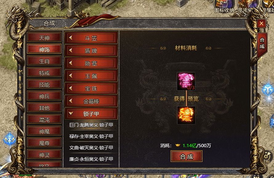 想要获得锁子甲,玩家可以通过挑战游戏中的首领BOSS来获取。不同级别的首领BOSS掉落的锁子甲等级也不同,高级的首领BOSS可能掉落更高级的锁子甲。此外,玩家还可以利用低级的锁子甲通过合成系统来合成更高级的锁子甲。每合成3件相同级别的锁子甲,需要消耗大量的元宝,并且合成过程中有一定的成功率。