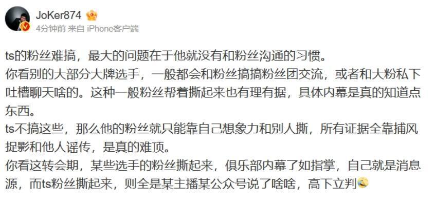 他的原文内容中,最重要的一段是:因为Theshy不和其他选手一样私下和大粉聊天,粉丝知道点内幕,导致Theshy的粉丝全靠想象力和捕风捉影的证据和人撕B。这确实是theshy一直存在的问题。