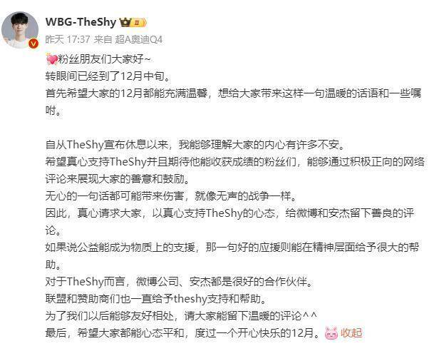 在节奏发酵到转会期的最后一天,结果最终得到的结果就是theshy休息了,这些都直接惹怒了theshy的粉丝们,对WBG各种口诛笔伐,而WBG这边也开始反击了,老板亲自加入战场,对争议比较大的几件事进行解释。