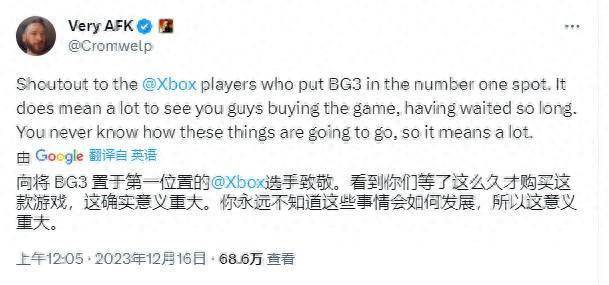“向Xbox玩家致敬,是你们让BG3成为Xbox商城最畅销的游戏。看到大家等了这么久购买这款游戏,这对我们意义重大。”