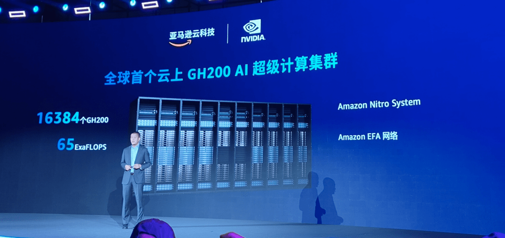 除了自家的芯片,会上还介绍了跟英伟达合作构建的全球第一个云上GH200 AI超级计算集群,支持用16384块Grace Hopper超级芯片一起干活儿,提供65个ExaFlops的逆天的算力。