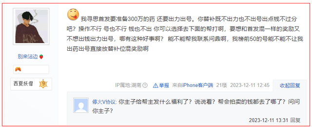 于是就在本届《逆水寒》诸神之战前搞了这么一个事件,要求替补玩家每个人都得拿出一些真金白银来补贴真正上战场的玩家,也相当于摊平成本了。