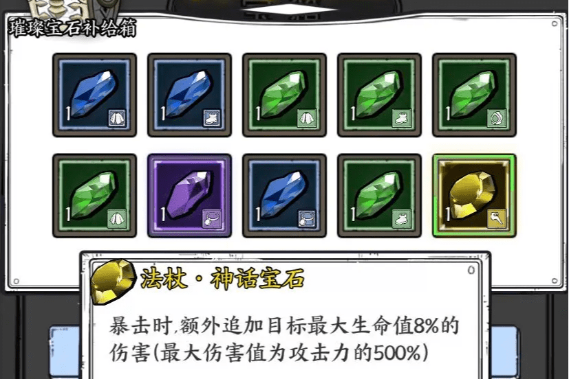 开局可以选择冰锥、雷击或飓风。建议全面提升技能等级。学徒和城墙是必须氪金的角色。学徒的最后两个技能暂时不得而知,可以暂时不升级;城墙则先选择最后一个城墙技能,然后再升级其他技能。暴击率的宝石可以保留,用于特定的神话宝石。