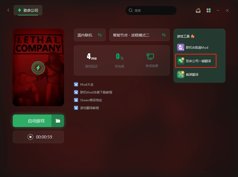 接下来玩家可以找到右方的游戏工具,在里面直接找到致命公司一键翻译选项,然后选择开始一键翻译。操作起来也是比较简单的。