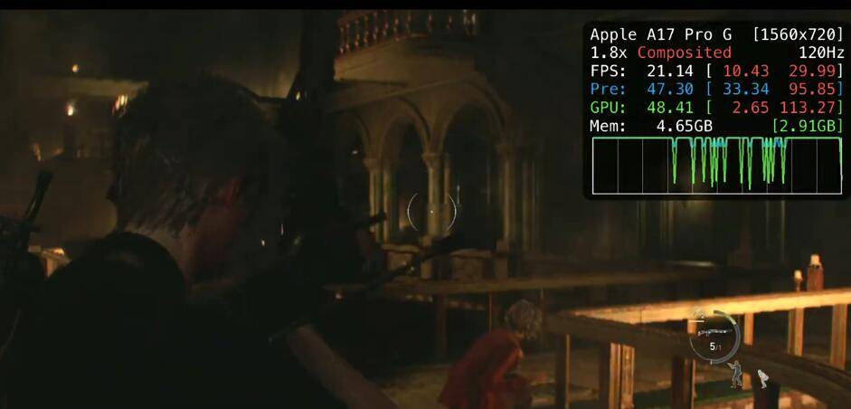 该游戏iOS版帧率上限为30FPS,可iPhone 15 Pro运行《生化危机4:重制版》只开启了720P分辨率,顺带也开启了苹果MetalFX 锐化技术,在整体运行负载不高情况下,游戏帧率表现依然让人非常失望,一旦进入较为复杂的搏斗场景,比如需要操作屏幕躲避怪物攻击,或者要手持武器攻击怪物,帧率下降就会非常明显,比如下面这个场景,画面就出现了卡顿,帧率也暴跌至21FPS,这非常不利于游戏操作。