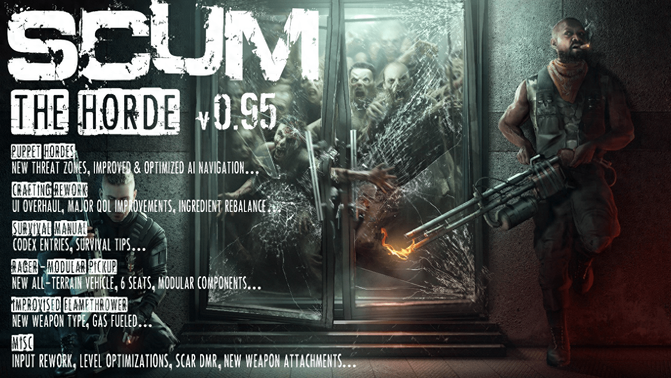 《人渣》的0.95更新,“部落”(The Horde),欢迎所有新玩家上手。此次更新引入了生存法典(Survival Codex),这是一个全新的游戏内数据库,包含了玩家在《人渣》世界中生存和发展所需的所有基本信息。从移动控制和生存技能,到基地建设和属性,应有尽有。除此之外,这次更新还增加了新的生存提示,它们会根据玩家的当前情况,在游戏过程中定期弹出,提供有用的信息。制作系统也进行了重做,能提供更好的用户体验。