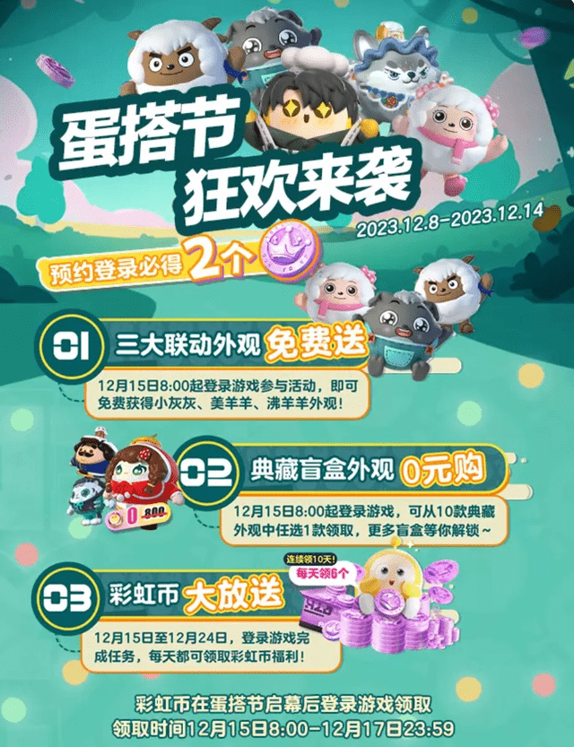 根据官方爆料,这次“蛋搭节”节分为三个大阶段。12月15日开启的欢蛋周,为玩家带来了大量的免费福利,联动外观、典藏盲盒0元购、多平台定制外观,及渠道专属外观,这些通通免费送。除此之外,“蛋搭节”还下起了彩虹币雨,12月15日至12月24日期间,每天登录可领取6个彩虹币,连续登录10天相当于领取了十连抽!实在是太幸福啦!