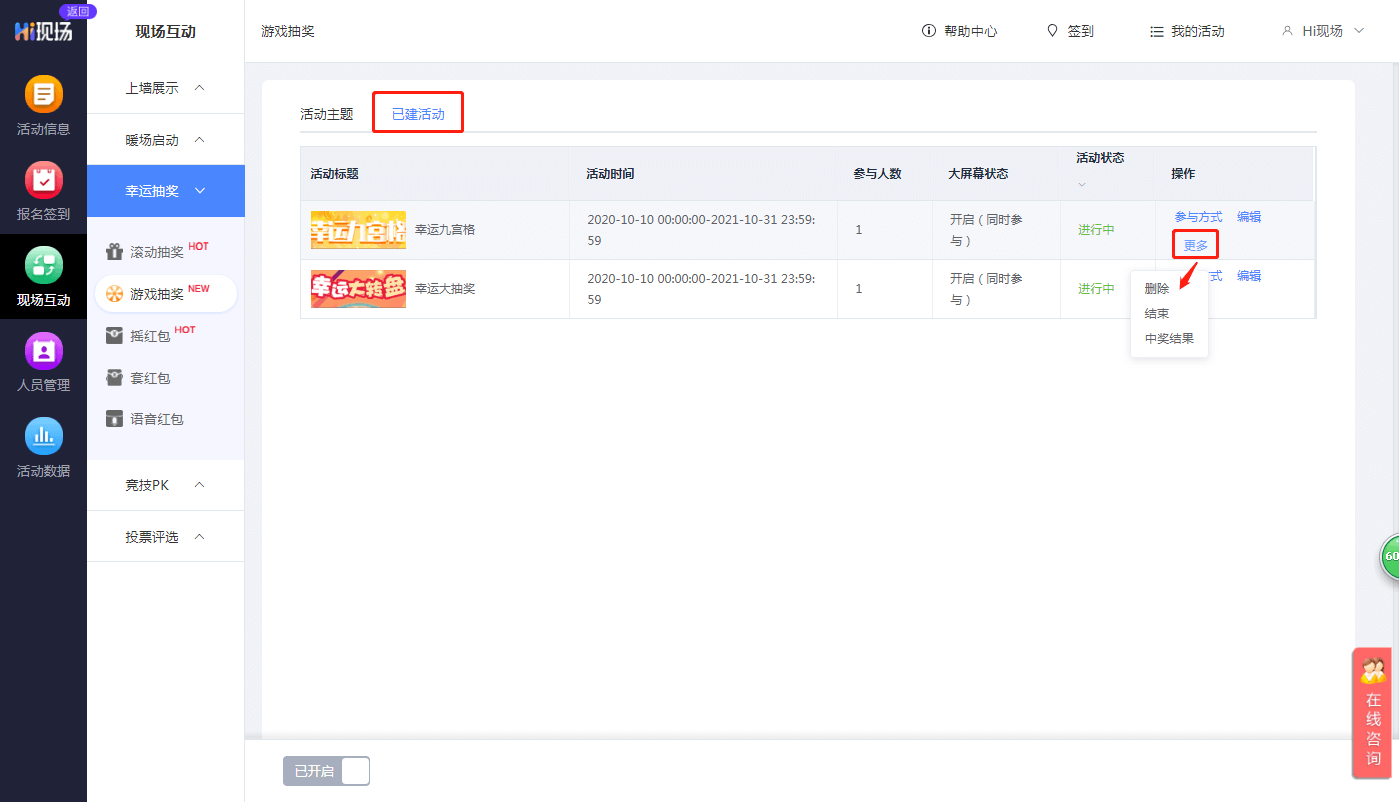 “更多”中可删除、结束某轮抽奖,也可在此处查看中奖结果