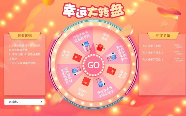 3、大转盘抽奖:这种抽奖形式流传已久,相信大家都见过线下的飞镖转盘,或者手动转盘抽奖。hi现场互动的线上大转盘抽奖可以容纳更多的人参与,大屏幕上转盘转动,台下大家不需要排队避免拥挤,只要扫描二维码即可,结果也显示在大屏幕上。这种大家都熟知的抽奖方式最大的好处就是大家一看到转盘就知道在抽奖,不需要过多的宣传和解释大多数人会来凑个热闹。