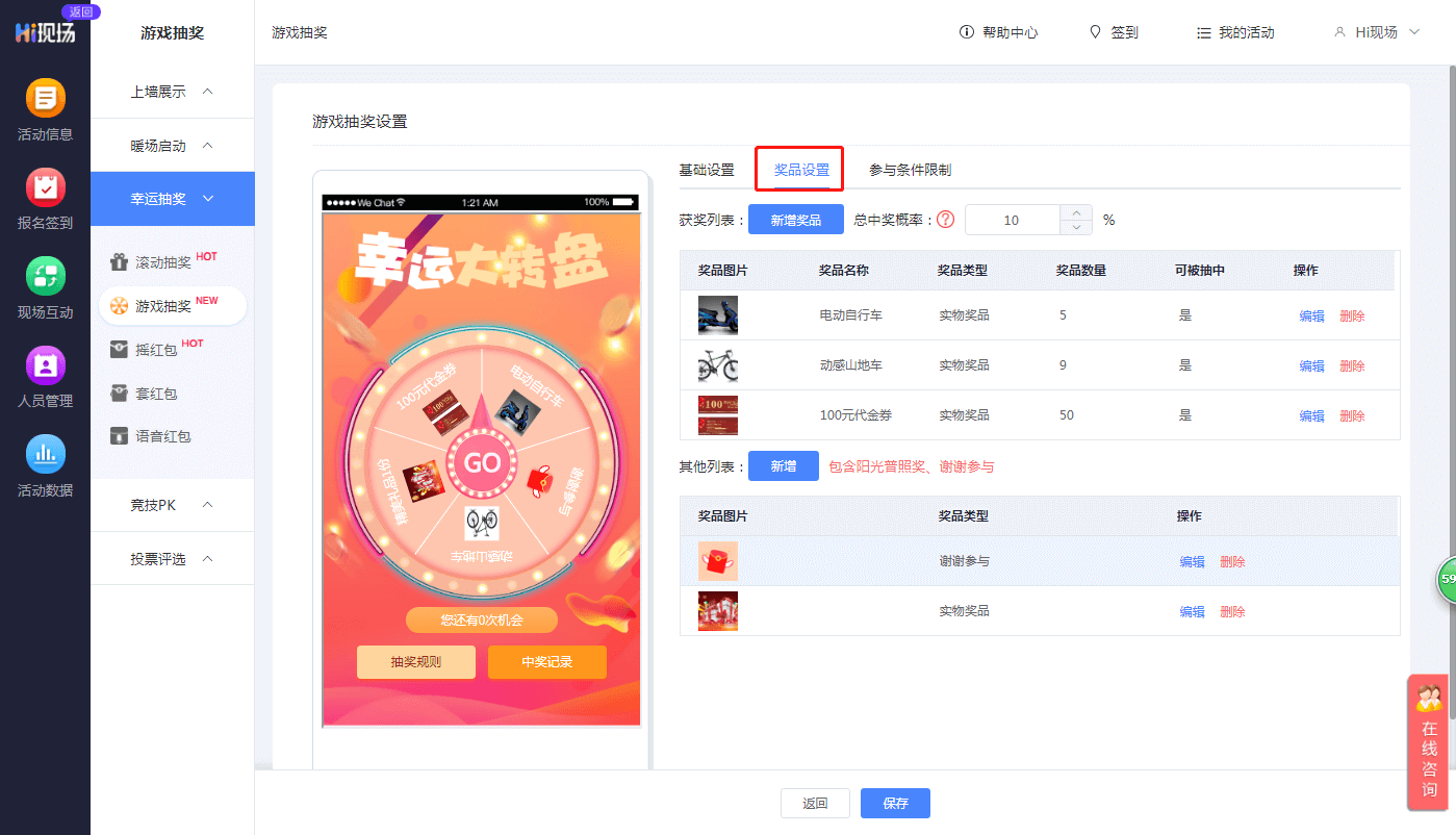 2.奖品设置:可添加现金红包或实物奖品,并且可以设置中奖概率