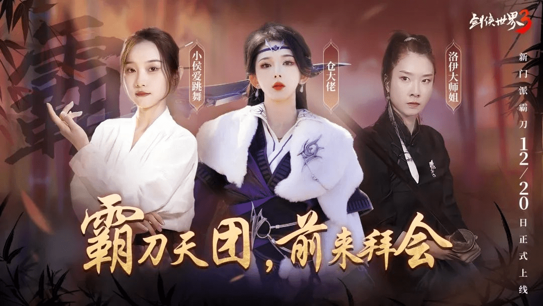 武林如此热闹,若是有佳人相伴岂不美哉?本次资料片为少侠们感受霸刀的绝世魅力,还特邀抖音国风女神“仓大佬”,功夫女侠“洛伊大师姐”,专业舞者“小侯爱跳舞”组成【霸刀天团】,此番大阵仗。只为助阵【霸刀】门派荣耀登录剑侠江湖!