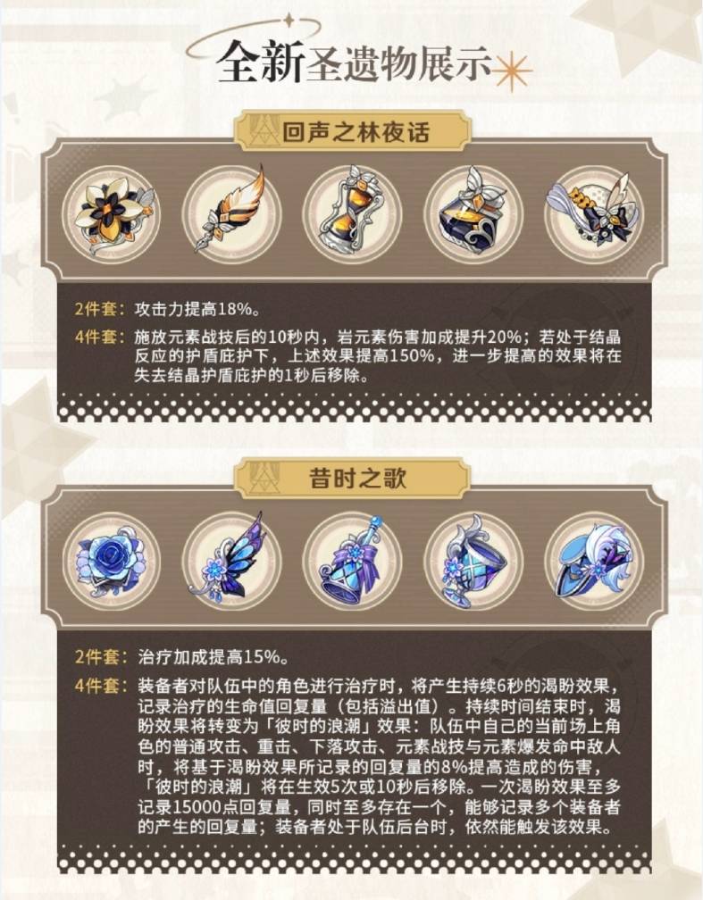 本次版本中还新增了两套圣遗物,回声之林夜话与昔时之歌。