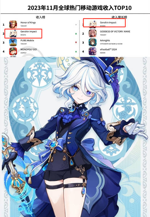 在近期更新的11月全球手游收入榜上,米哈游的《原神》一扫下半年以来的颓势成为了收入增长最快的游戏。以1.93亿美元的数据超越《PUBGM》,位居全球手游收入榜第二位。而《原神》之所以能够做到这点,也离不开11月的大更新以及新角色芙宁娜的上线。