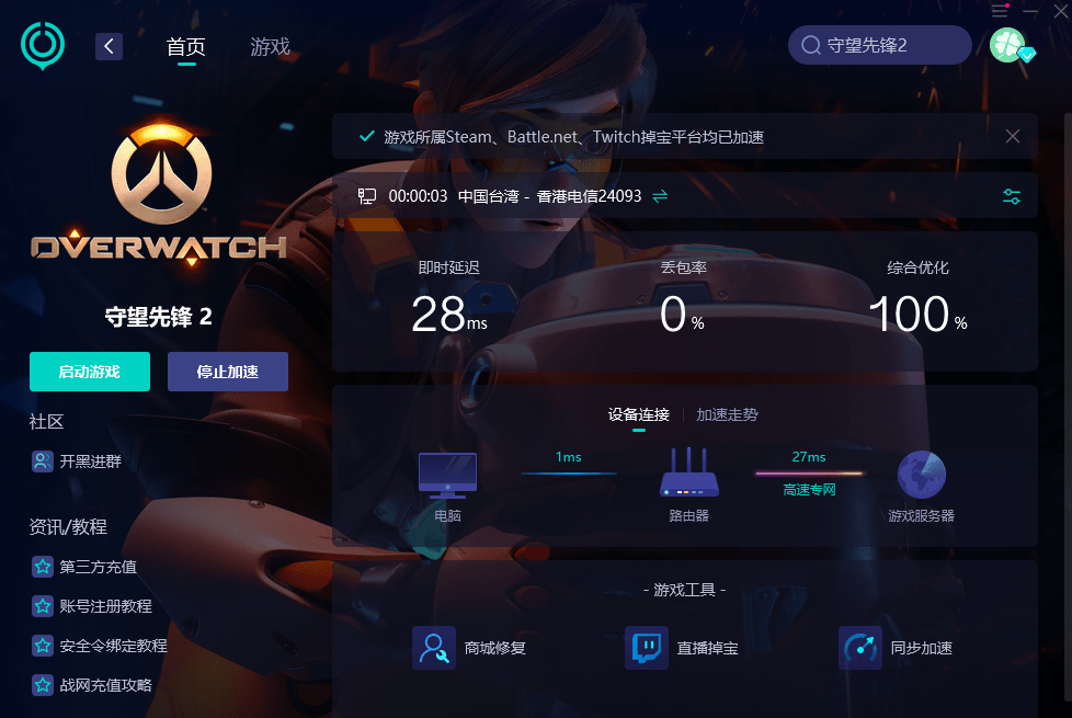 2、点击即可优化网络,流畅游玩守望先锋2国际服