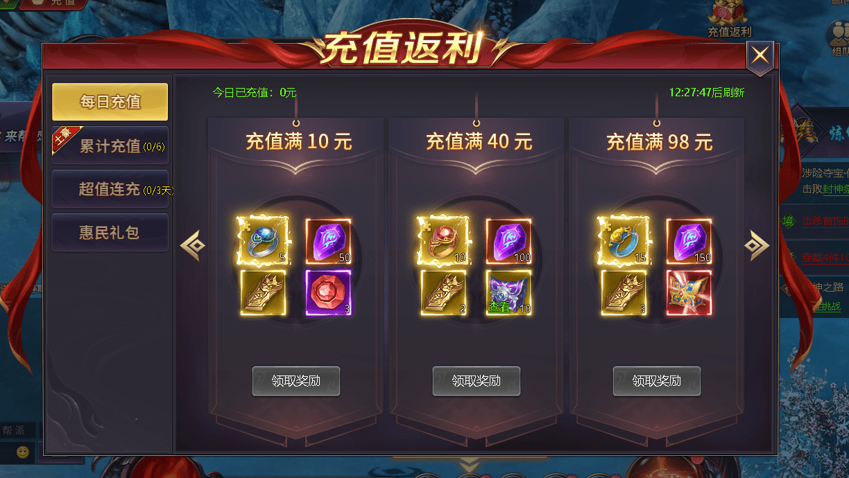 神魔之道 充值折扣 每日充值后可以在充值返利里面领取各种好礼 第一个每日充值 达到指定的档位就可以领取 还有累计充值奖励可以领取 右上角还有每日小礼包 有两万的钻石三天的超值连充也能领取到 只要每天10元就可以了 特权卡里面有个小秘书 可以免费试用半个小时 在这期间这些boss都可以双倍刷怪 只要10元就可以激活7天小秘书 然后每天都可以领取到1000的元宝 只要用上我们的充值折扣 这些都是半价得到 更多隐藏福利评论区见 进游戏找客服 报传奇小智的名字可以领取礼包一份
