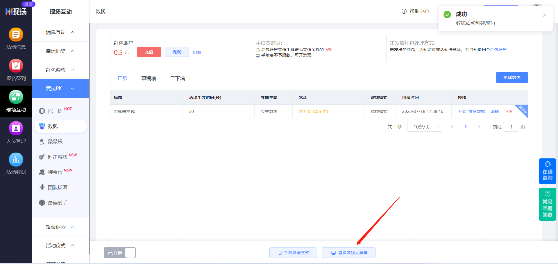 点击“查看数钱大屏幕”——进入到数钱游戏等待页面