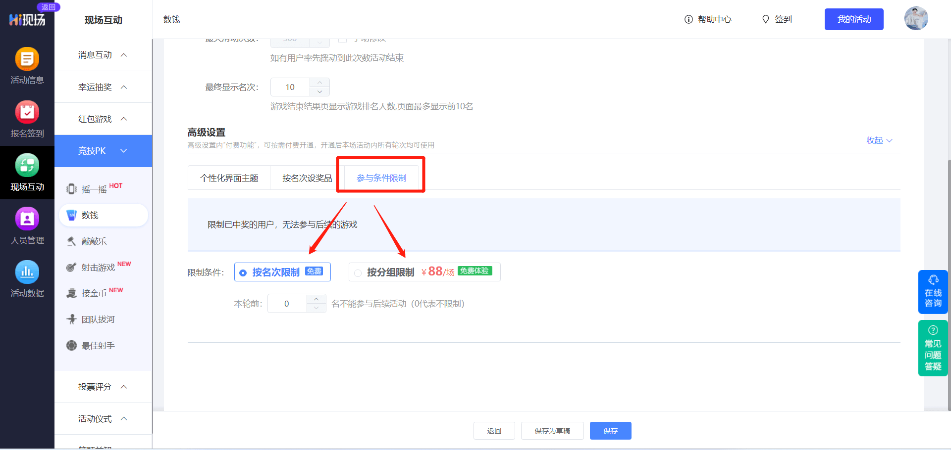 按名次限制,或者按分组限制,分组内人员可按照设置参与互动