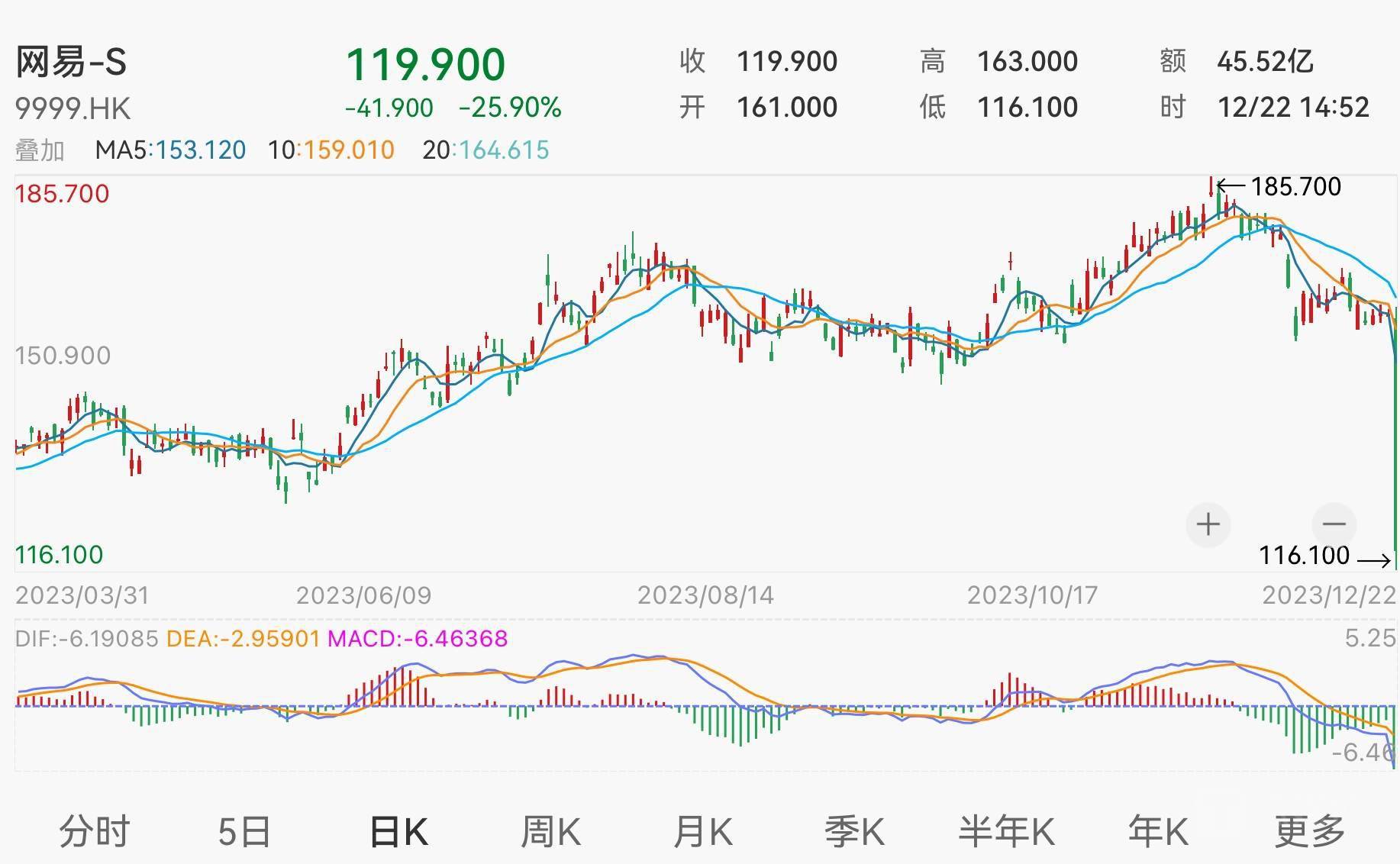 12月22日午后,港股游戏股遭重挫,尤以(09999.HK)跌幅最甚,盘中一度大跌超27%,创下自今年1月4日以来的股价新低,为116.1港元。