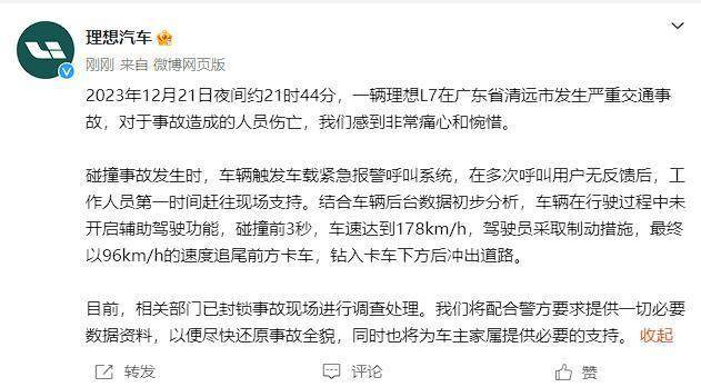 2023年12月21日夜间约21时44分,一辆理想L7在广东省清远市发生严重交通事故,对于事故造成的人员伤亡,我们感到非常痛心和惋惜。