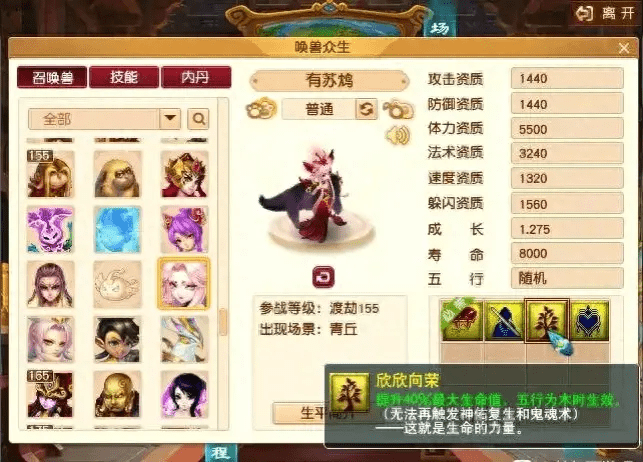 欣欣向荣的作用效果为提升40%的最大生命力,五行为木时生效。无可置疑,就是利用这个技能合血宠。比如上图这月魅,其实是野生没进阶的,但是这个属性作为血宝宝对于任务已经够用了,打造成本大概只需要55万游戏币,但不包含内丹成本。当然,进阶另外算。