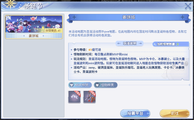 玩法规则:在圣诞活动期间,玩家们可以进入地图挑战圣诞特色怪物。击败MVP怪物有机会获得稀有卡片,而击败普通怪物则有机会获得丰厚的奖励。此外,地图中还会随机刷新圣诞宝箱,开启后可获得丰富的奖励。