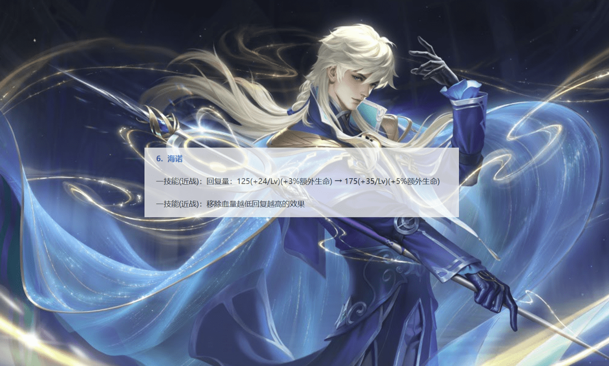 海诺这个英雄已经加强过好几次了,作为新英雄,曾经的三体人,混到如今的状态,着实让人唏嘘。此次策划加强了海诺一技能的近战的回复量,同时移除了血量越低回复越高的效果。整体而言,还是加强,玩家也不用冒险追求低血量高回复,高风险高收益的操作。调整的数据太小,并不能对海诺产生太大的影响,具体表现如何,还要等实装后玩家的实测。