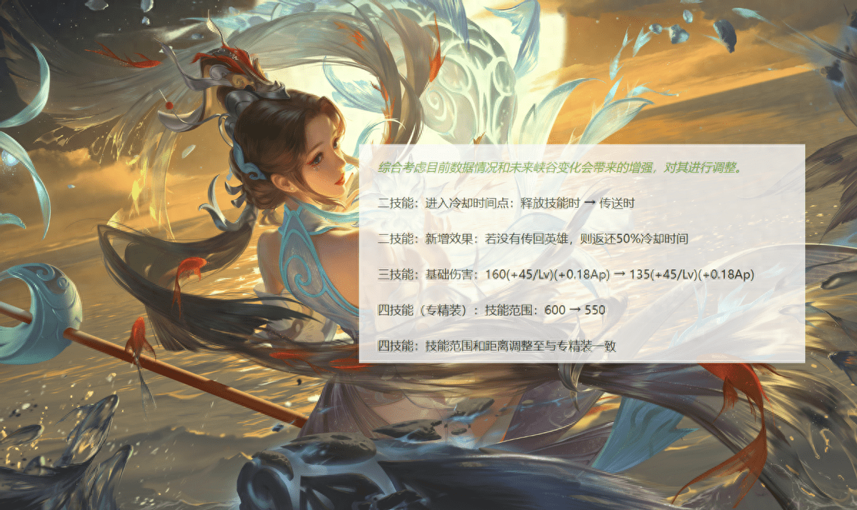 王昭君的削弱让人意外,虽然她在高端局出场率很高,但她也没有强势到被人捧上ban位的地步。草丛三姐妹都是热门英雄,王昭君算是一个综合能力稍微强势的法师,有着不错的出场率。此次调整削弱了王昭君前期的强度,后期数据上也没有强太多,前期的节奏点会变慢,但王昭君核心的玩法就是工具人,对于绝活哥而言,此次调整影响并不大。
